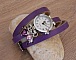 Montre bracelet en cuir violet au cadran argenté décoré d'une cascade de perles nacrées de diverses tailles dans les couleurs Mauve/violet/parme.