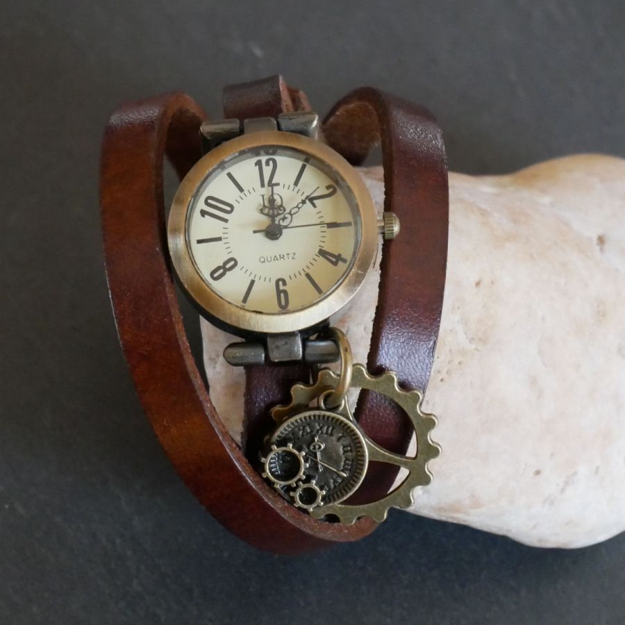 Montre bracelet en cuir couleur au choix style vintage et steampunk avec ses breloques engrenages et mécanismes d'horloge