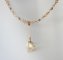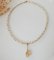 Le coeur est mis en valeur par une élégante barrette de suspension doré et tout le collier est réalisé avec une alternance de toupies en cristal Swarovski (en coloris Crystal adouci d'ombre dorée ou argentée) avec des petites perles nacrées dorées Swarovski également.